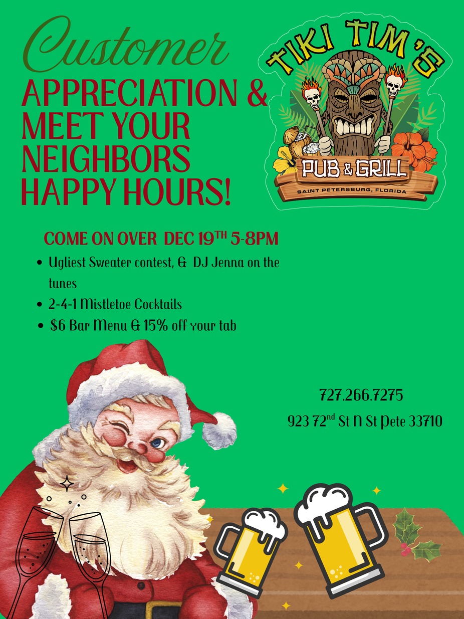 Hey y'all! Let's do some feel-good work! We are asking that you consider helping us help our community! In light of certain shutdowns and the economy in general, we want to give back, and we hope you will too!! We are offering a FREE Kids' meal with the purchase of a regular meal! We are also asking for anyone able to bring canned goods and nonperishable items to help get these families thru the Holidays! We will be accepting donations here at Tiki Tims 923 72nd St N St Pete 33710, and we are partnered with our local Love Thy Neighbor, who helps the community in so many ways!! Help us Help our community now Thru Dec 30th! Thank you in advance!!11:00 AM - 06:00 PM
