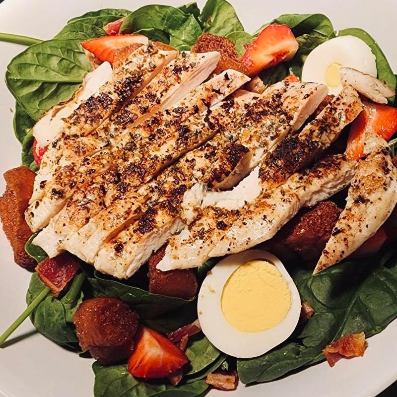 Fresh Baby Spinach, Hard Boiled Egg, Croutons, Bacon, Red Onion, and Fresh Strawberries with a Balsamic Vinaigrette dressing. Add Grilled Chicken $3.95 or add Grilled Shrimp $5.95